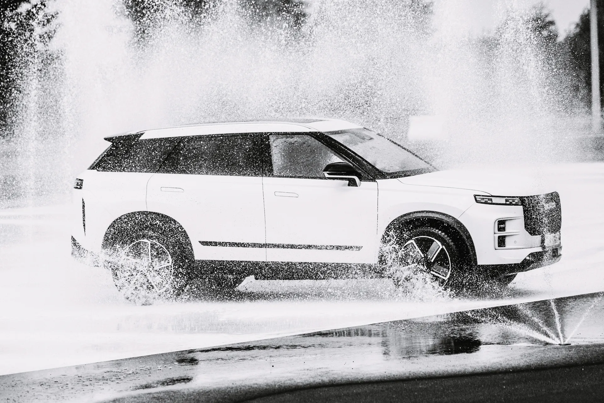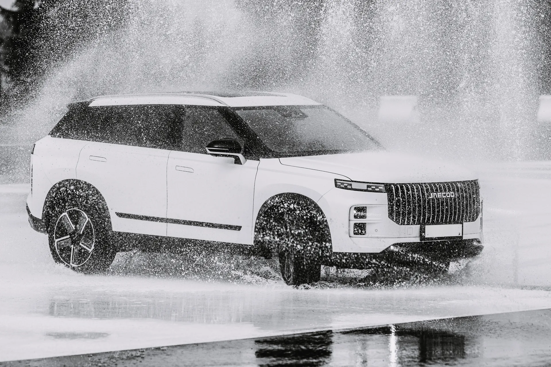 – dynamiczne zdjęcia na mokrym torze pod Warszawa, podkreślające stabilność, przyczepność i bezpieczeństwo pojazdu